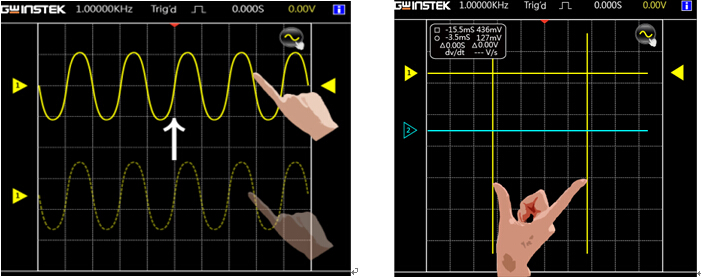 GDS-300/GDS-200系列示波器采用全觸控電容式液晶顯示器,在這個智能型手機爆炸的時代,固緯電子亦能帶領(lǐng)使用者進入全觸控的量測時代。使用者可以利用一根手指頭,將量測中的波形進行上下移動,也可以隨意調(diào)整觸發(fā)基準線的位置。此示波器也同時支援兩點觸控,工程師可以利用雙指進行垂直電壓準位的調(diào)整,亦可以隨心所欲地進行時間尺度的縮放,全新的觸控感以及快速的反應(yīng)讓您對量測的觀感煥然一新。此外,可以利用單指在主屏幕上進行拖拉式的選單選擇,讓使用者以最直覺的方式尋找到需要量測的功能物件,也可以隨時隨地的進行圖形以及資料的存取。